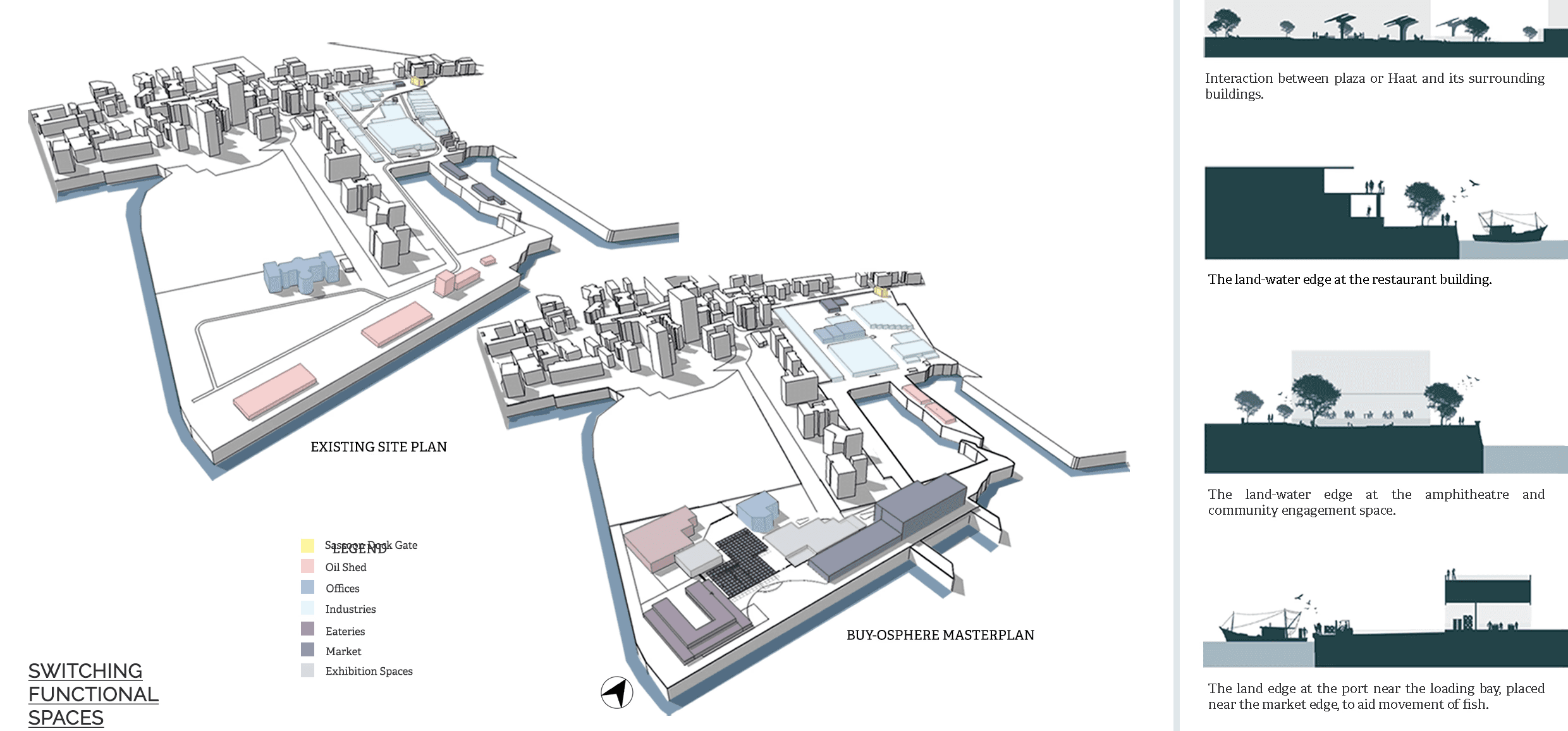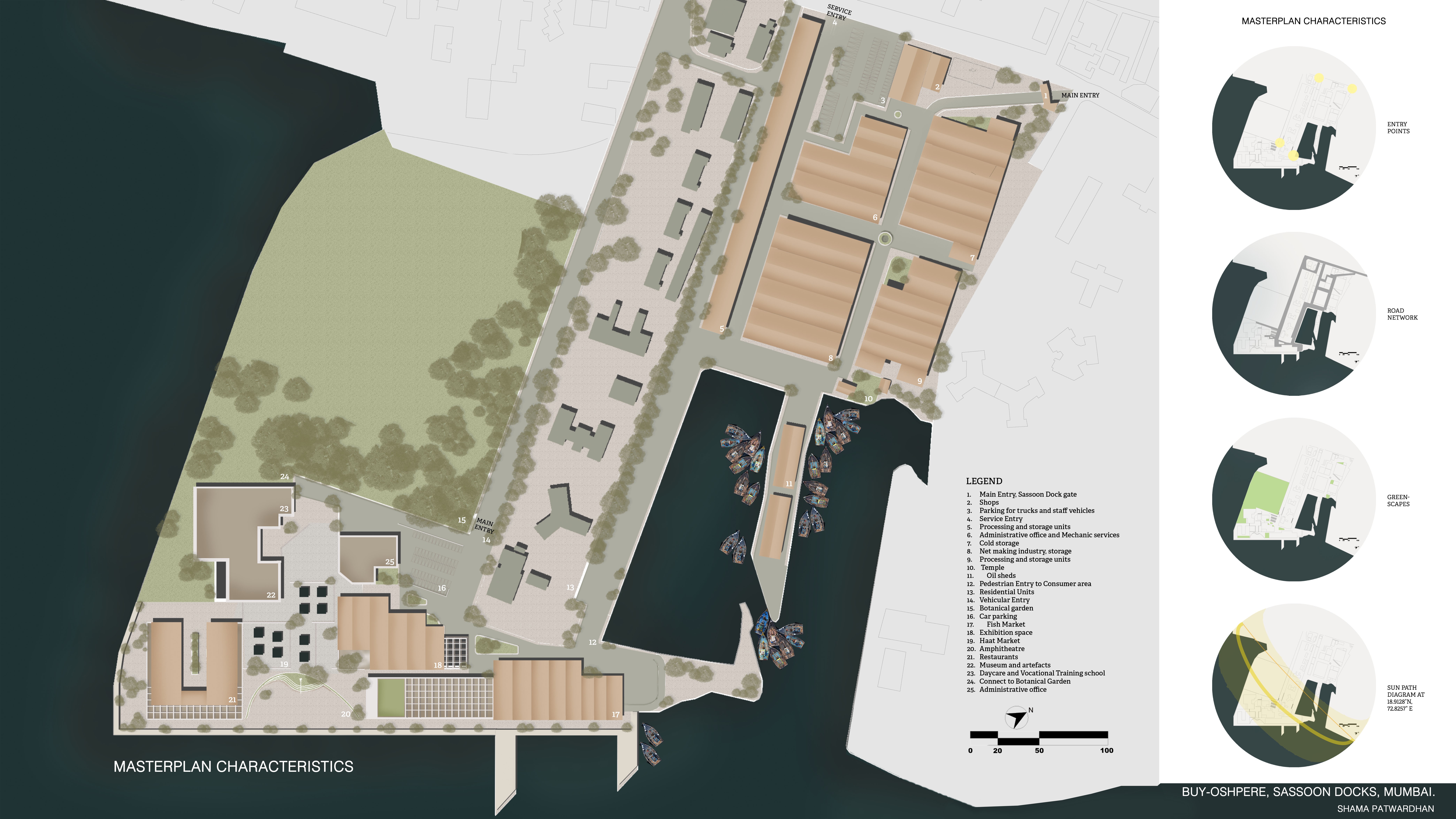 I proposed a master plan with distinct entries, integrating vendors, eateries, live food counters, and comfort spaces in the fish market building. The design emphasizes visual appeal with restaurants and amphitheaters, features advanced cold storage, and includes site management offices, a vocational training institute, exhibition spaces, and a daycare facility..