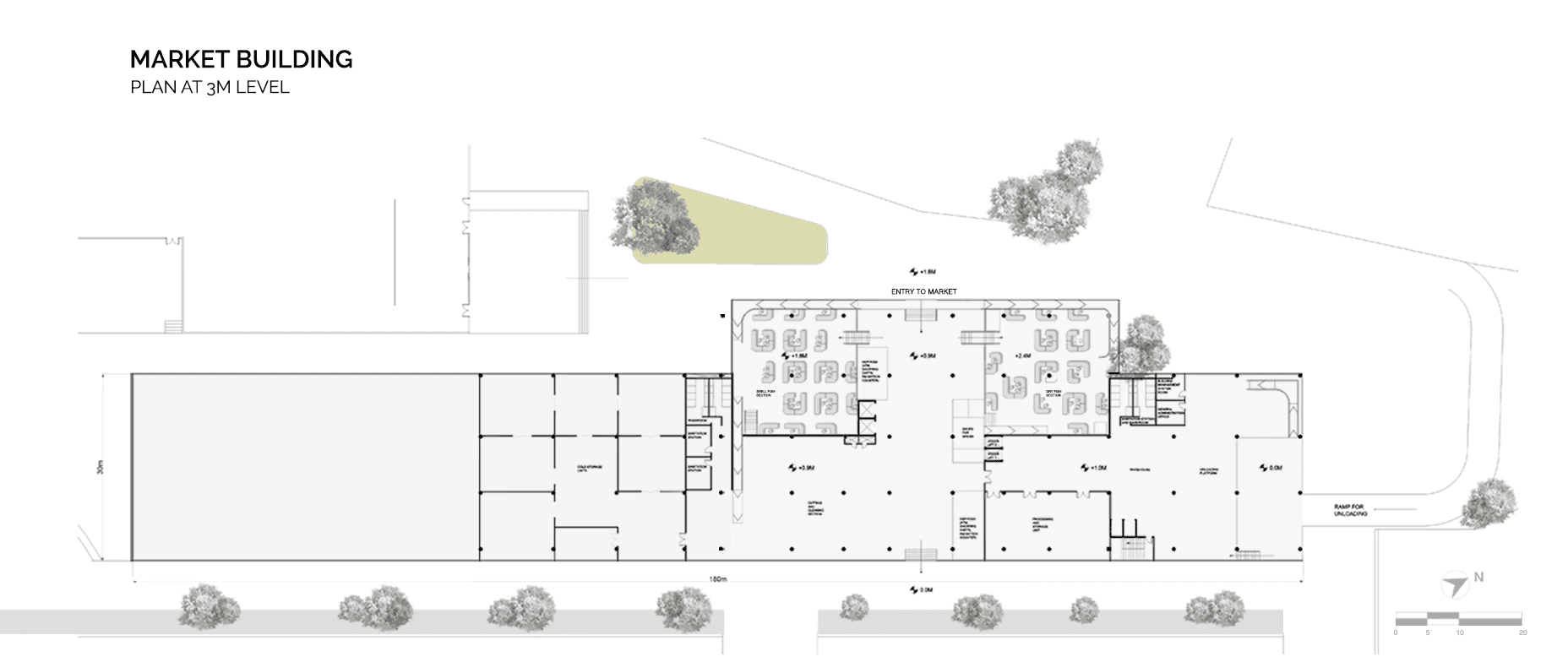 Site plan divides into Consumer (fish market, restaurants, exhibition spaces, offices, museum) and Production areas (oil sheds, truck parking, loading bays, cold storage, net making). Production area, accessible to the public, provides insights into the fishing industry, while consumer areas are targeted for general public use.