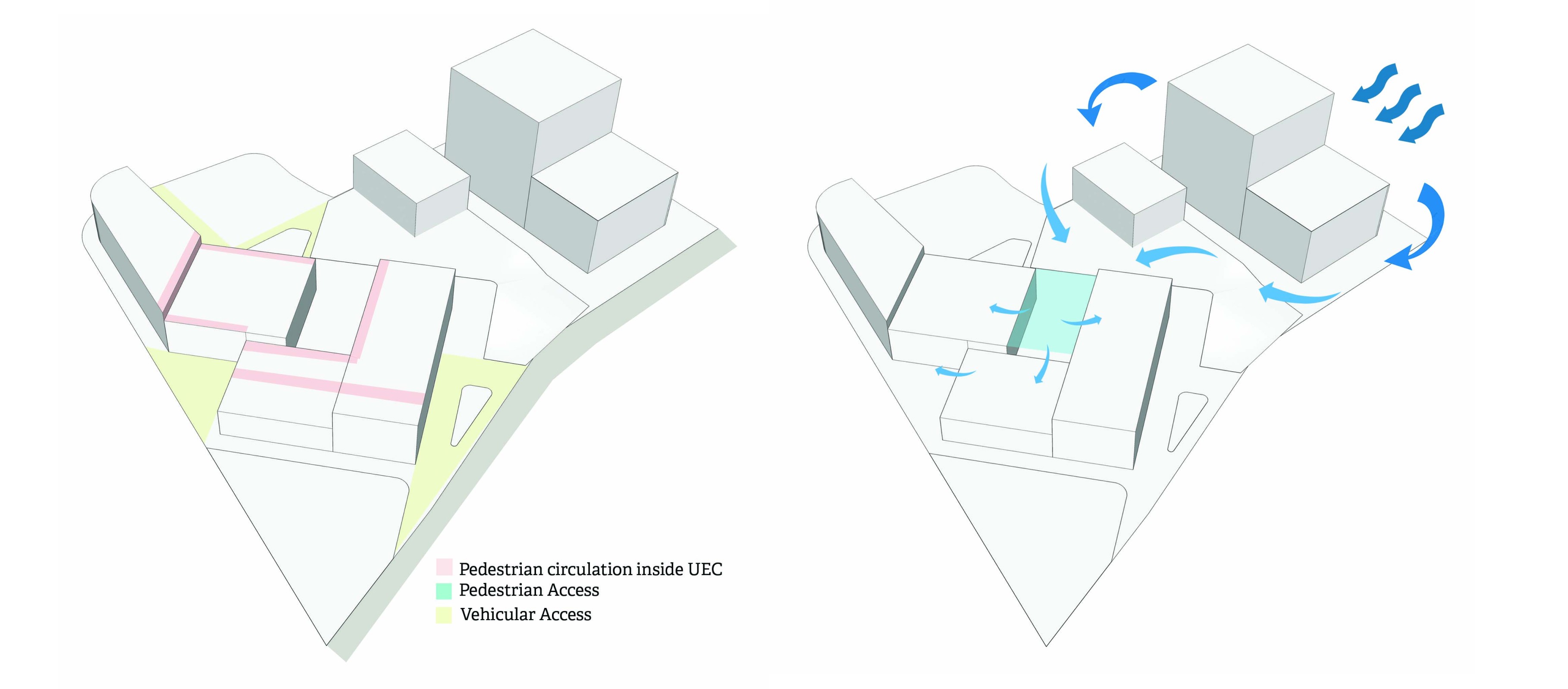The central atrium promotes natural air circulation and creates a pleasant open-air court, while vehicular access is restricted to the site’s perimeter to maintain a pedestrian-friendly environment.