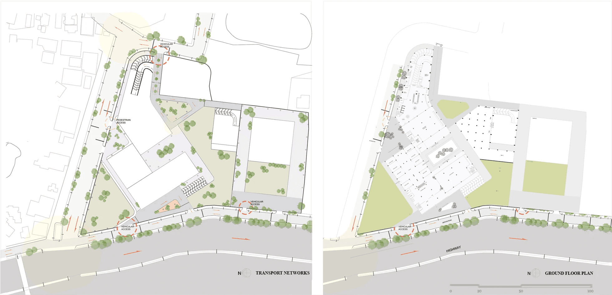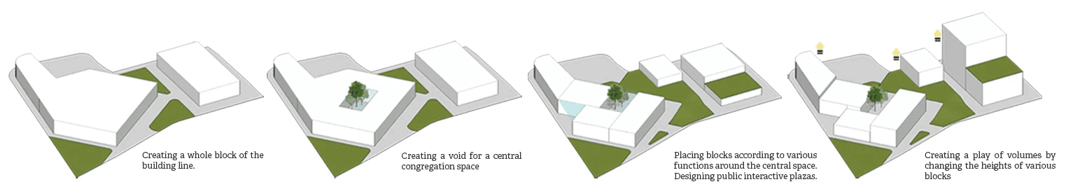 The master plan emphasizes maximum road frontage for commercial spaces and a fully walkable campus, with vehicular access limited to the periphery. At its core is a sunken plaza—an open-air social hub for gatherings and events. Lush greenery weaves through the plaza and buildings, creating a hybrid of public park and marketplace that encourages community interaction and reimagines retail as a social, outdoor experience.