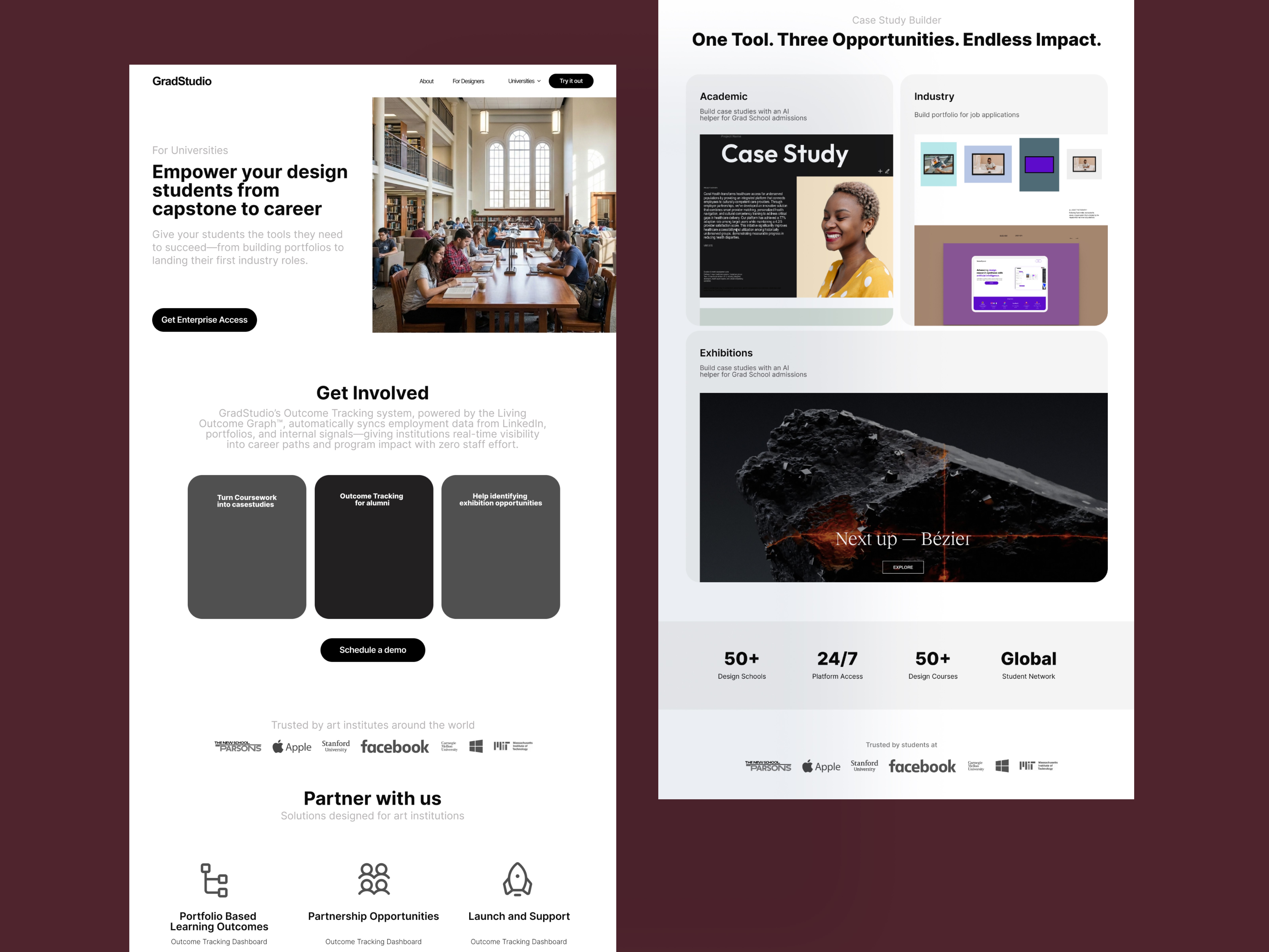 GradStudio aimed to help educational institutions track student outcomes and career trajectories. I designed and built their homepage and marketing website to clearly communicate their vision, mission, and the value of their Outcome Tracking system.