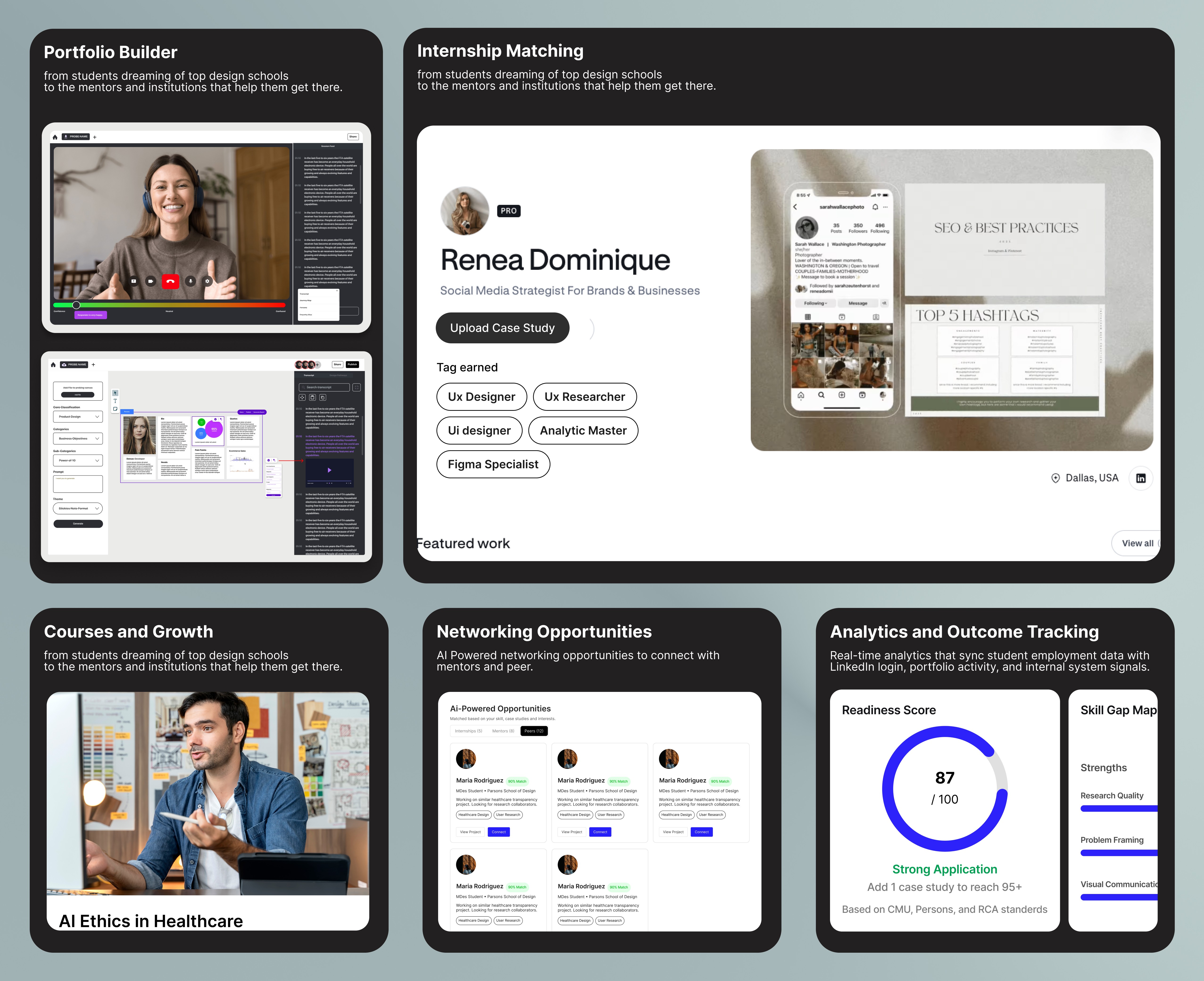 The platform unifies portfolio-building, mentorship, and capstone-to-career pathways in a learner-centered flow.