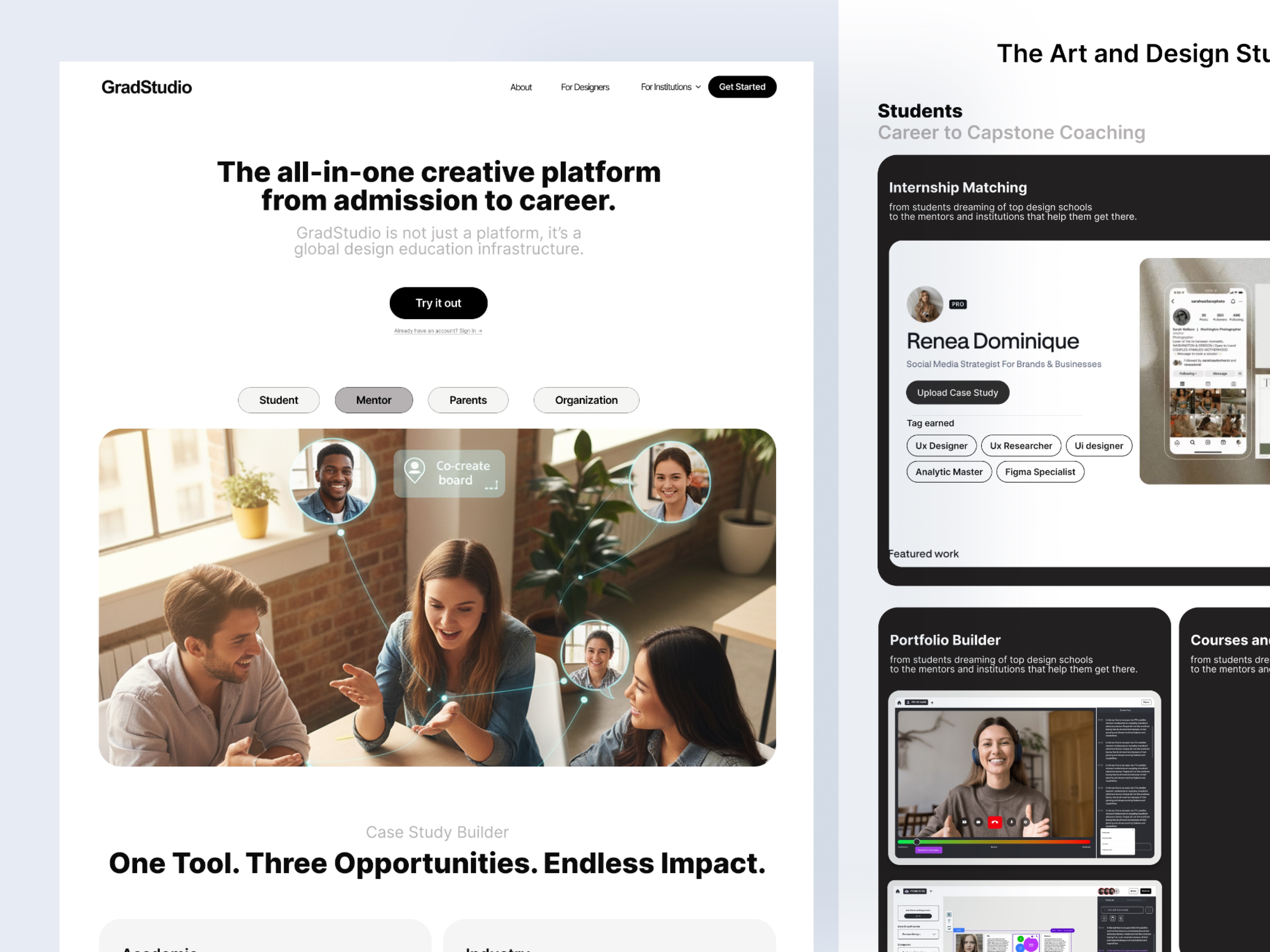 I also designed a marketing website for GradStudio that effectively communicates the brand’s vision, mission, and core value propositions to users.